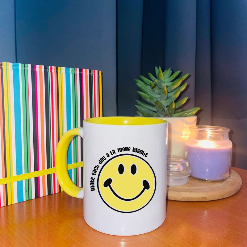 Infuse your mornings with sunshine using our Yellow Ceramic Coffee Mug featuring a heartwarming illustration of a cheerful yellow smiley face and the motivating quote “Make each day a lil more bright”. With its vibrant design and uplifting message, every sip gives you a daily dose of positivity and becomes a reminder to have a brighter day. Whether you’re gifting a friend or adding to your own collection, this mug is a ray of warmth that promises to turn even the simplest moments into sources of joy with the radiating yellow ceramic.